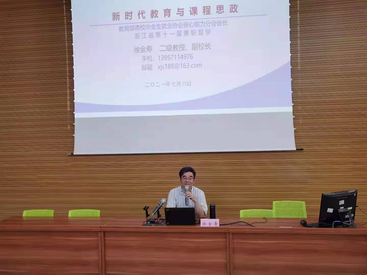 为全面落实立德树人根本任务,形成专业课程与思政课程同向同行的育人格局,为推进建立本科、高职和中职一体化课程思政体系赋能。7月7日,学校副校长徐金寿教授应台州第一技师学院邀请作《新时代教育与课程思政》专题讲座,对课程思政的理念、设计与实施进行了讲解。100余名教师聆听了此次讲座。